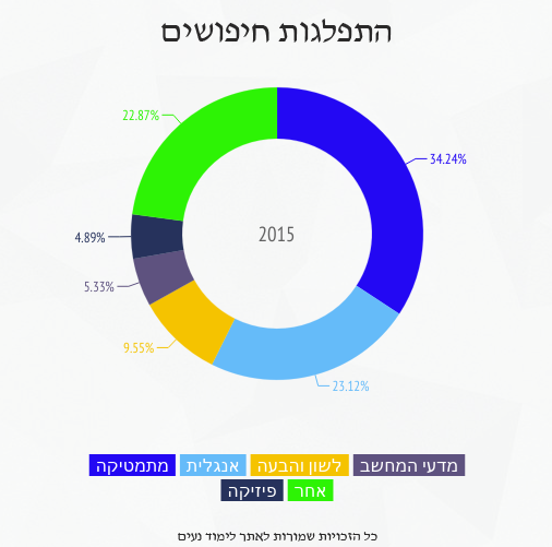 החיפוש הנפוץ ביותר, בפער די גדול מהשאר, הינו עבור שיעורים פרטיים במתמטיקה - 34% מכל החיפושים.