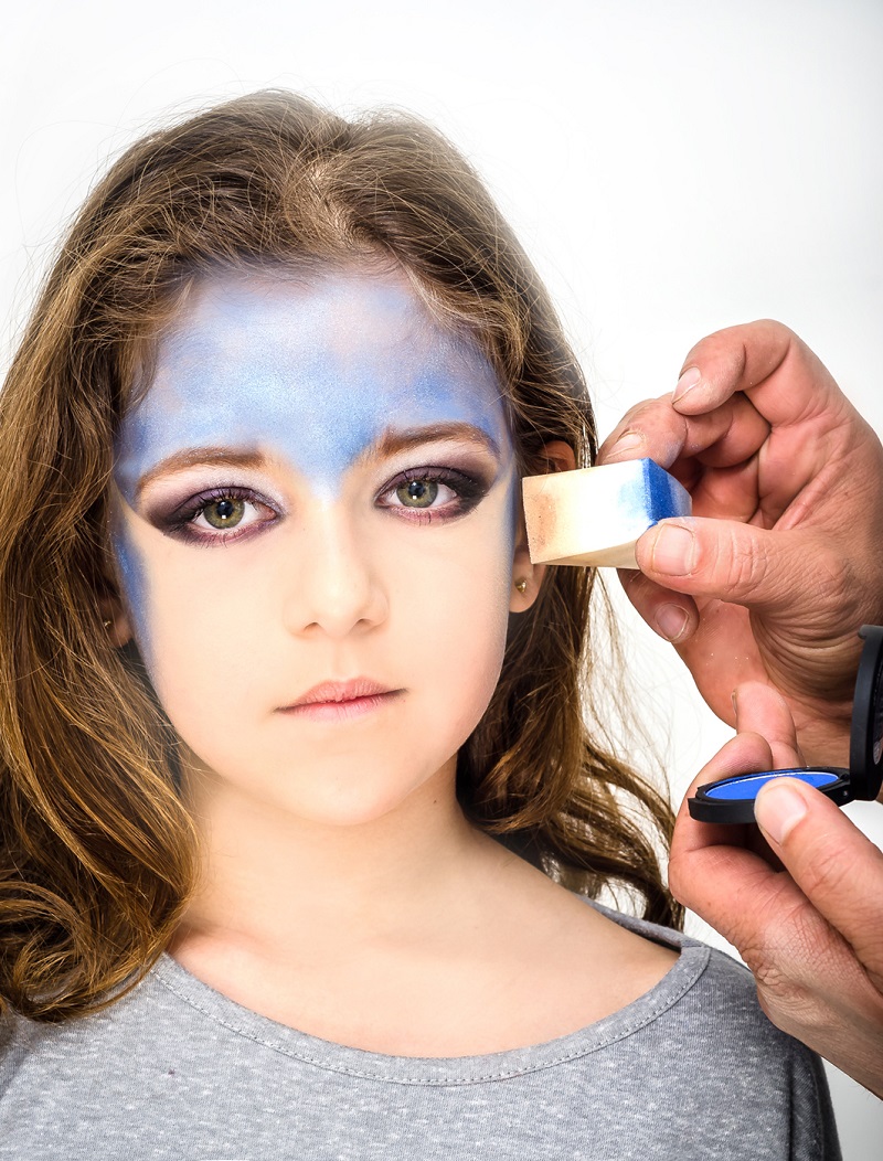 בעזרת צללית שחורה לתחום את העפעף העליון ולהדגיש את הזויות החיצונית של העין. היות ומדובר באיפור ילדים יש להעדיף תמרוקים באבקה ופחות כאלה המוצעים במרקם נוזלי. עם צללית סגולה נשלים את איפור העפעף ובפיגמנט שנותר על המברשת נוסיף ממנה גם בקו העפעף התחתון.