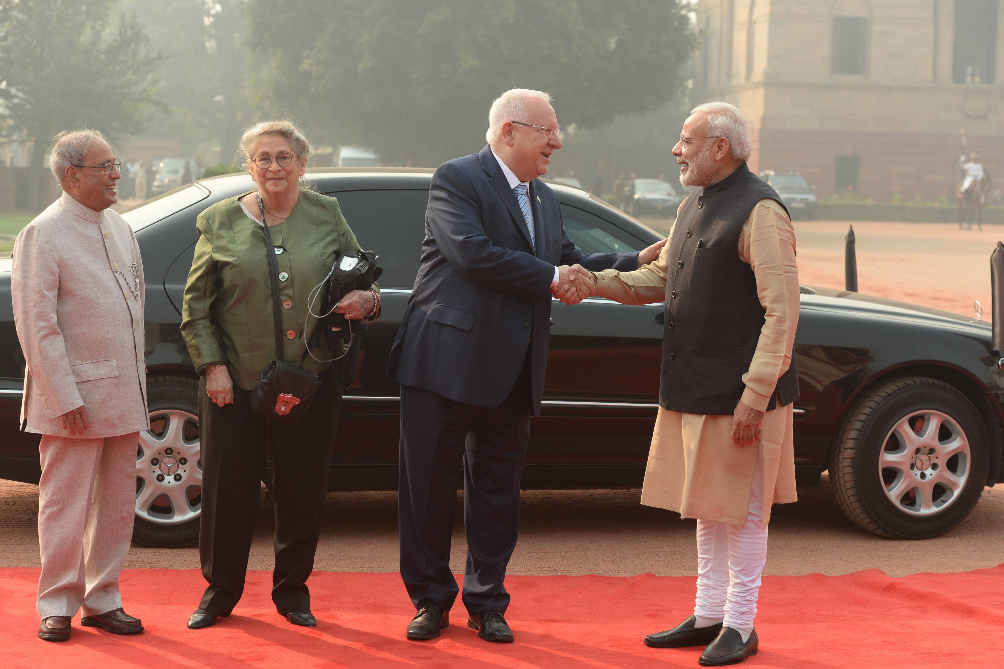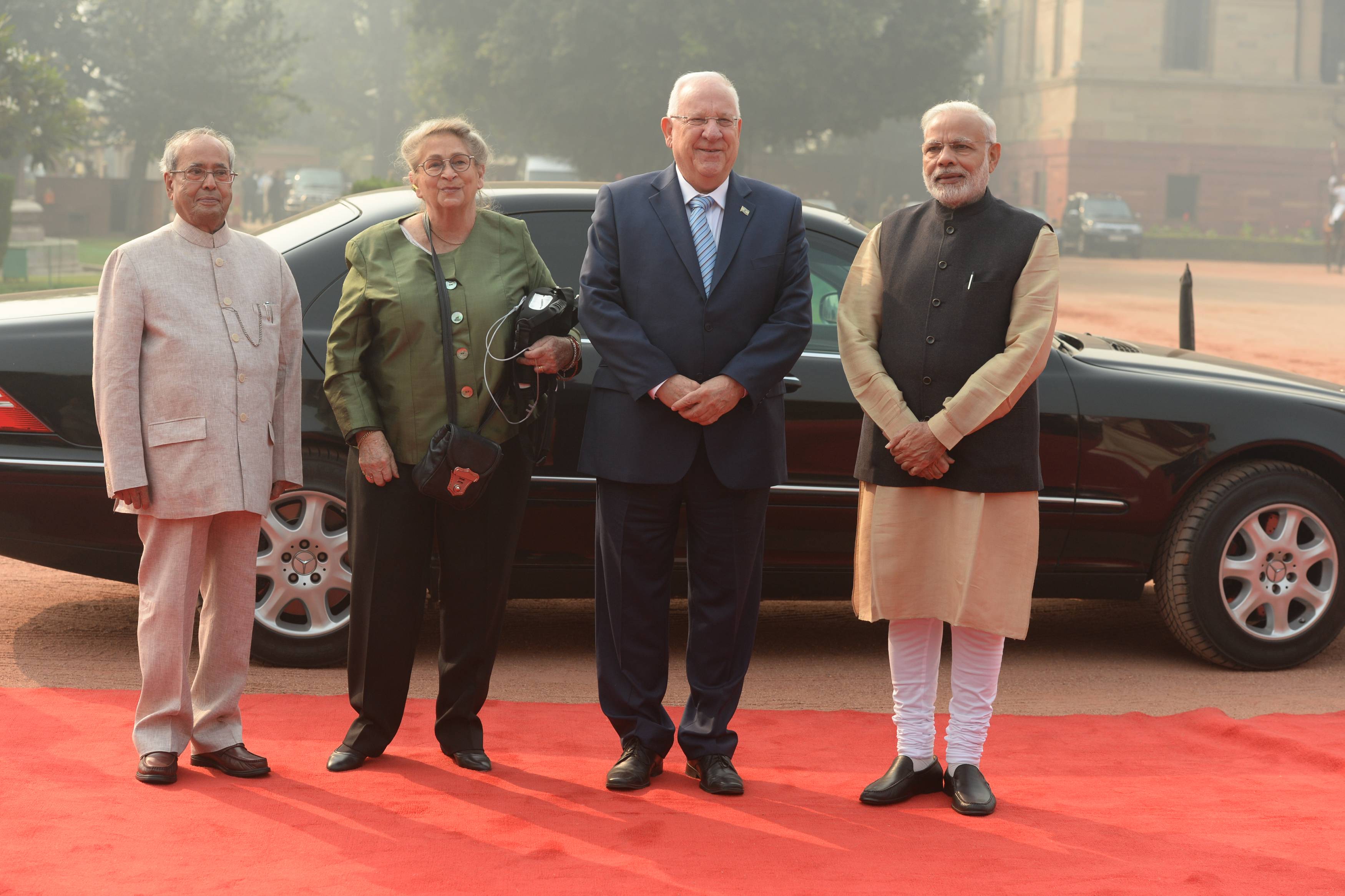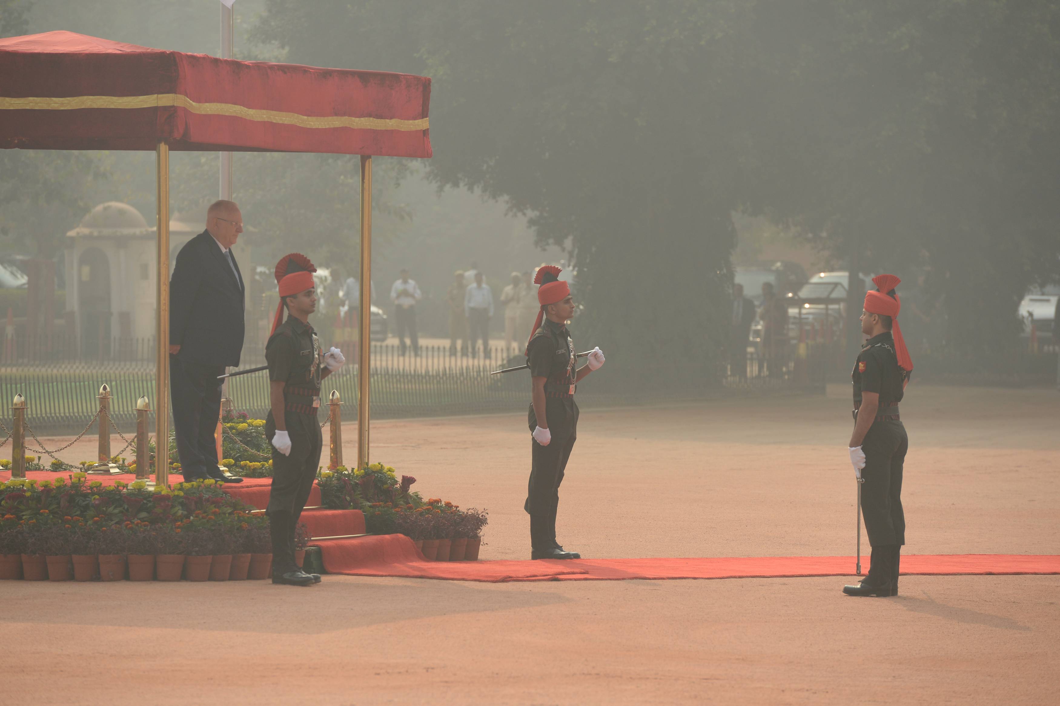 נשיא המדינה, ראובן (רובי) ריבלין, פתח היום, שלישי, י"ד חשון, 15 בנובמבר, את ביקורו באופן רשמי בטקס קבלת פנים ממלכתי שנערך לו על ידי נשיא הודו, פרנב מוקהרג'י, בארמונו. עם כניסתם למתחם לווה רכבם של הנשיא ורעייתו על ידי משמר פרשים. בהגיעו אל רחבת הטקס נוגנו המנוני שתי המדינות, ובסיום הצדיע מפקד המשמר לשני הנשיאים. הנשיא סקר את משמר הכבוד ולאחר מכן הוצגו בפניו בכירי הממשל ההודי.
