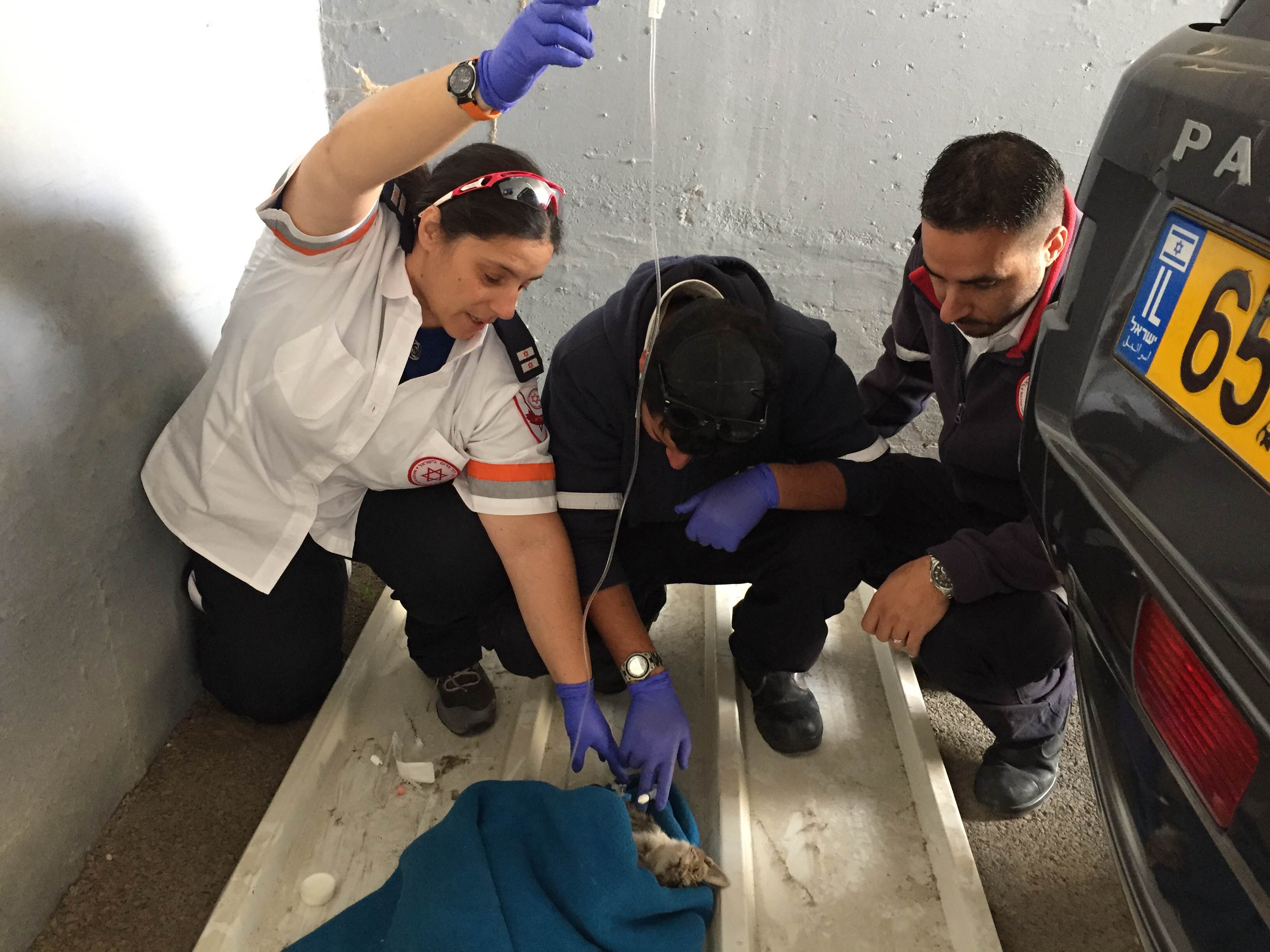 צוותי מד"א שערך הצלת החיים תמיד עומד לנגד עיניהם, לא חשבו פעמיים – הם ניגשו לגור החתולים, עטפו אותו בשמיכה, הבינו כי החתול גוסס עקב התיישבות חמורה ומיד התחילו במתן עירוי נוזלים לגופו.