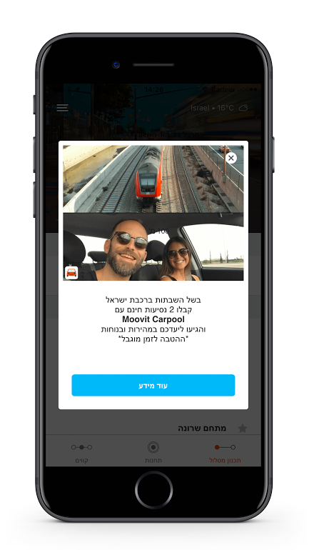איתי גיל סמנכ"ל וראש תכנית Moovit Carpool : "שני מיליארד המושבים הריקים ברכבים פרטיים בכל יום בעולם הם הדרך החכמה, הזולה והירוקה ביותר לעזור לאנשים להגיע בקלות למחוז חפצם. אנו מקווים ששתי נסיעות החינם יסייעו לנוסעים המחפשים אלטרנטיבה לרכבת או לאוטובוס המושבתים להתנייד בקלות ולהתנסות בשרות ה- carpool החדש. אנחנו מאמינים גדולים שהשילוב בין תחבורה ציבורית ונסיעה שיתופית, יוצר חווית נסיעה טובה יותר שתאפשר ליותר אנשים לבחור להתנייד ללא רכב ולהוריד את העומס בכבישים".