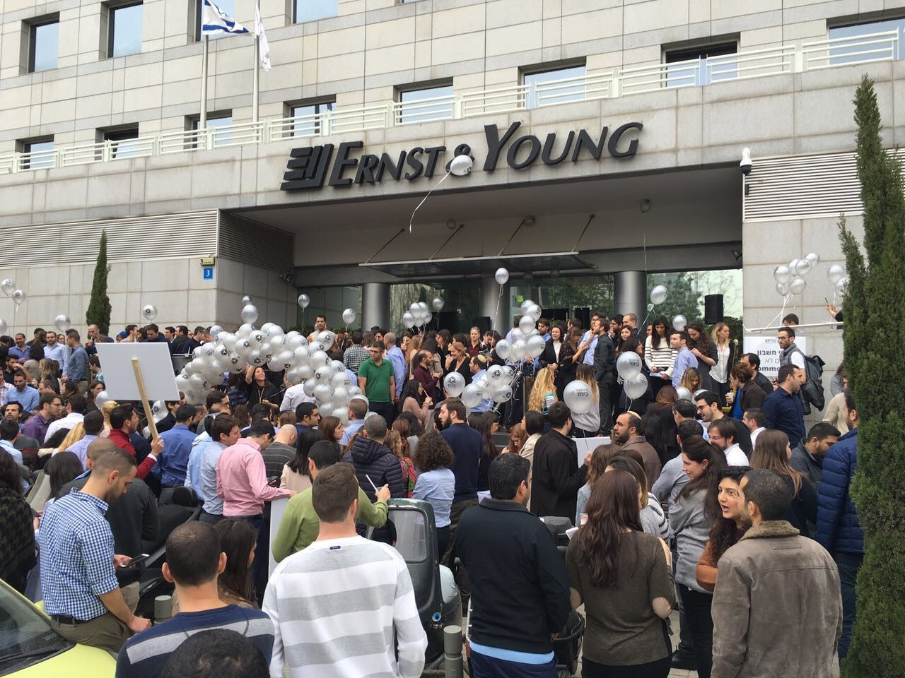 העובדים יורדים אל רחבת הבניין המרכזי בת״א (רח עמינדב 3) לאסיפת מחאה על רקע הסחבת וגרירת רגליים מצד ההנהלה חתימת הסכם קיבוצי ראשון בחברה ובענף ראיית החשבון כולו.