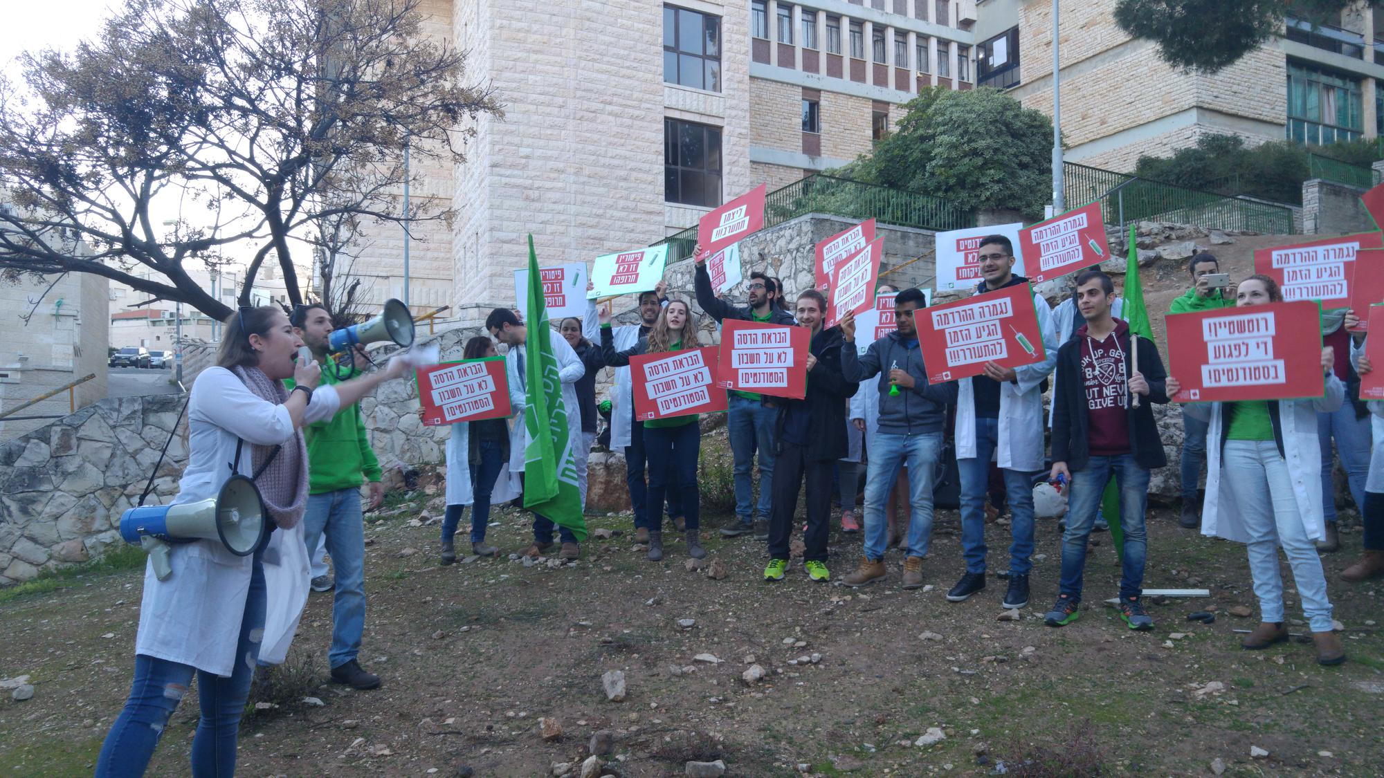הסטודנטים מפגינים בחלוקי רופאים והזמינו את ליצמן להצטרף אליהם ולהבטיח כי לימודיהם לא יפגעו בעקבות האירועים האחרונים בהדסה.