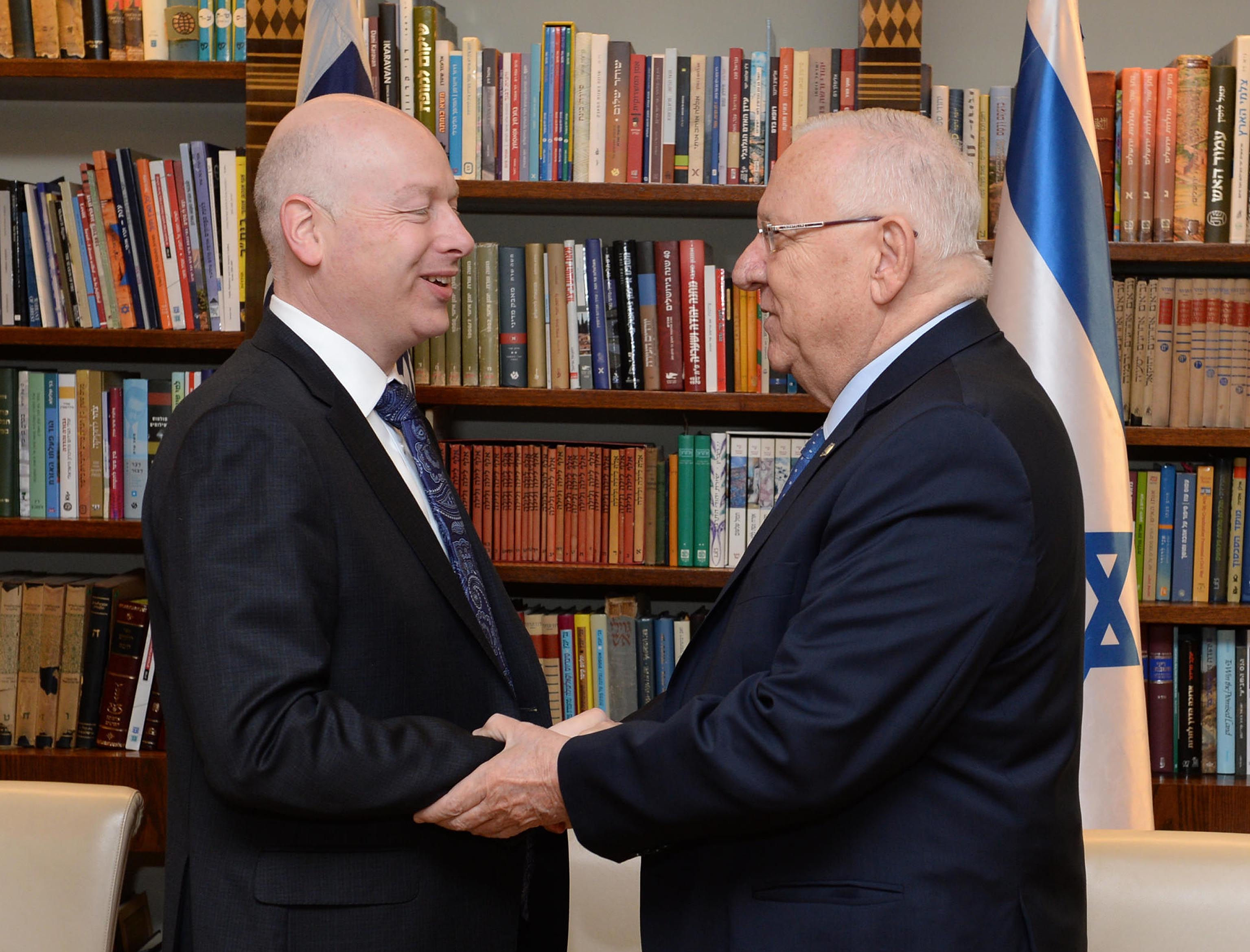 נשיא המדינה ראובן (רובי) ריבלין, נפגש היום, רביעי י"ז באדר, 15 במרץ, עם שליחו המיוחד של נשיא ארצות הברית דונאלד ג'יי טראמפ למשא ומתן בינלאומי ג׳יסון דב גרינבלאט, הבוקר בבית הנשיא בירושלים.