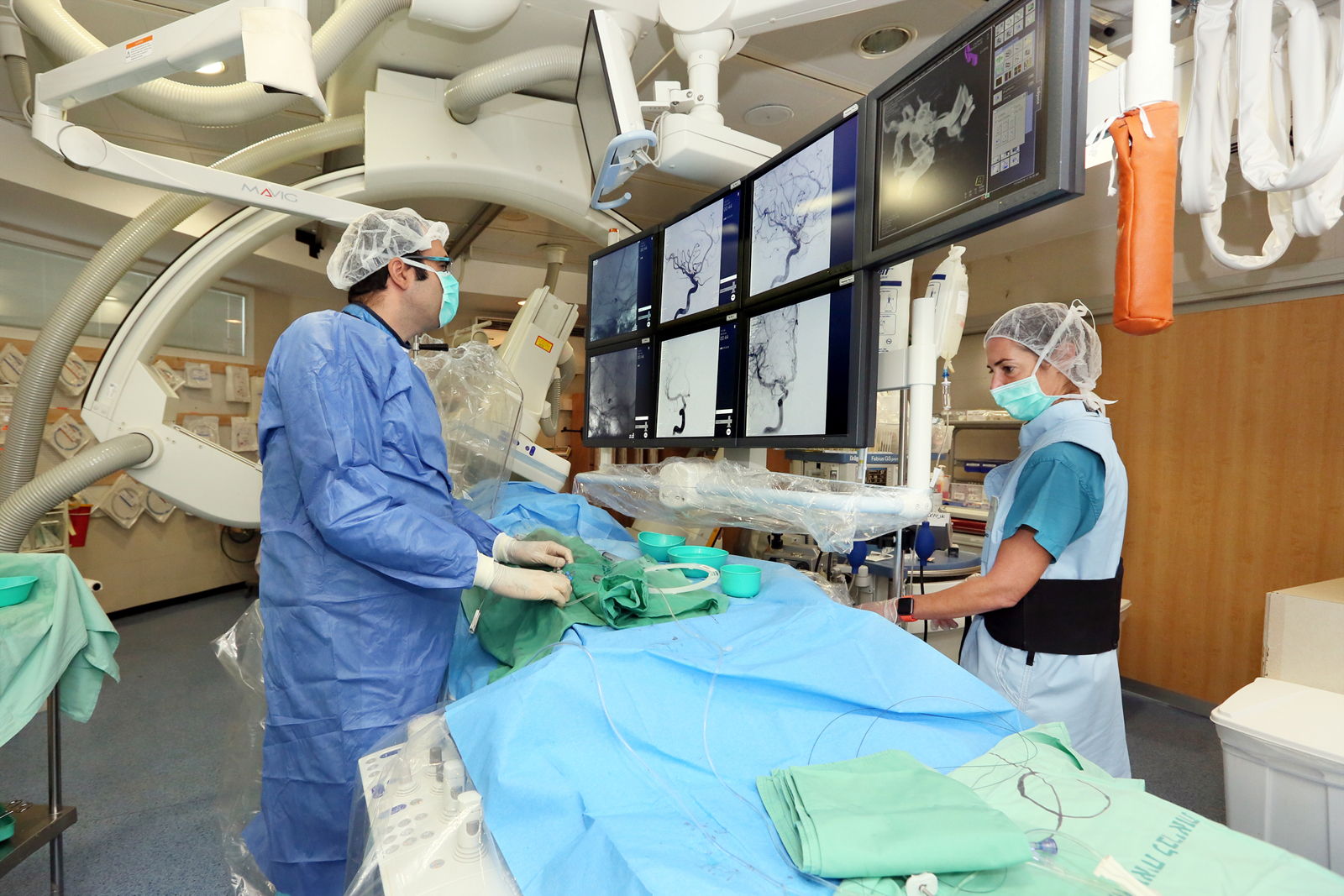בתמונה: ד"ר איתן אברגל, מ"מ מנהל היחידה לנוירו-רדיולוגיה פולשנית ברמב"ם ודנה בר-און, מרדימה בכירה, בהליך של צנתור מוחי. צילומים: פיוטר פליטר
