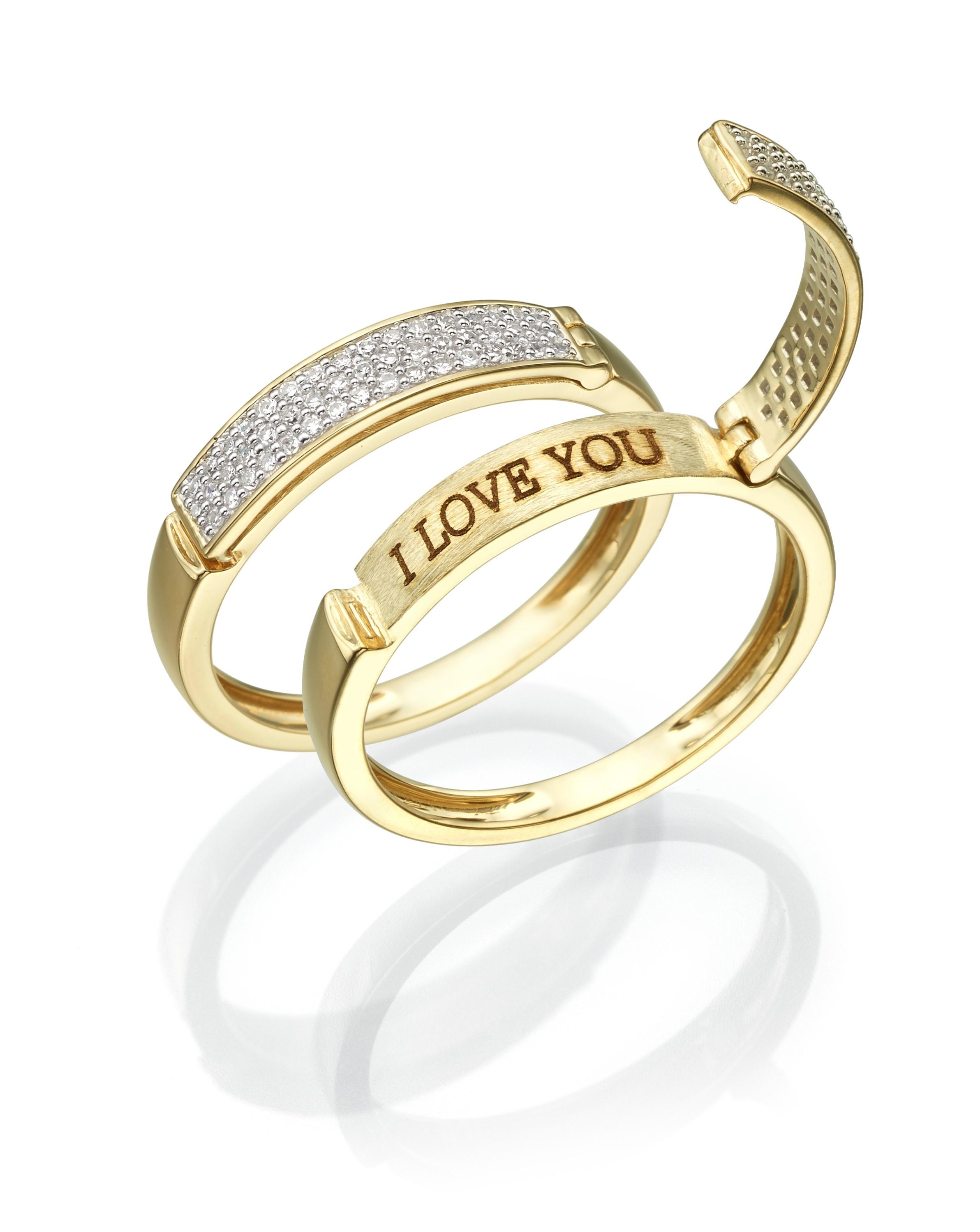טבעת MARRY ME הינה עיצוב ייחודי ומיוחד של רשת Impress. הטבעת עשויה מזהב ומעוצבת בשני רבדים: רובד עליון משובץ יהלומים המעניק לטבעת מראה יוקרתי ומיוחד. שורת היהלומים נפתחת ומתחתיה מופיע סוד ההקדשה עם חריטה של המילים MARRY ME המהוות את הצעת הנישואין.