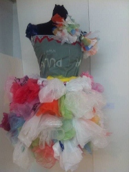 יולי בירן, תלמידת כיתה יוד, תל אביב, הציגה עבודה שעוסקת במיחזור: השימלה נעשת בדיגום חופשי, כולה משקיות ניילון.