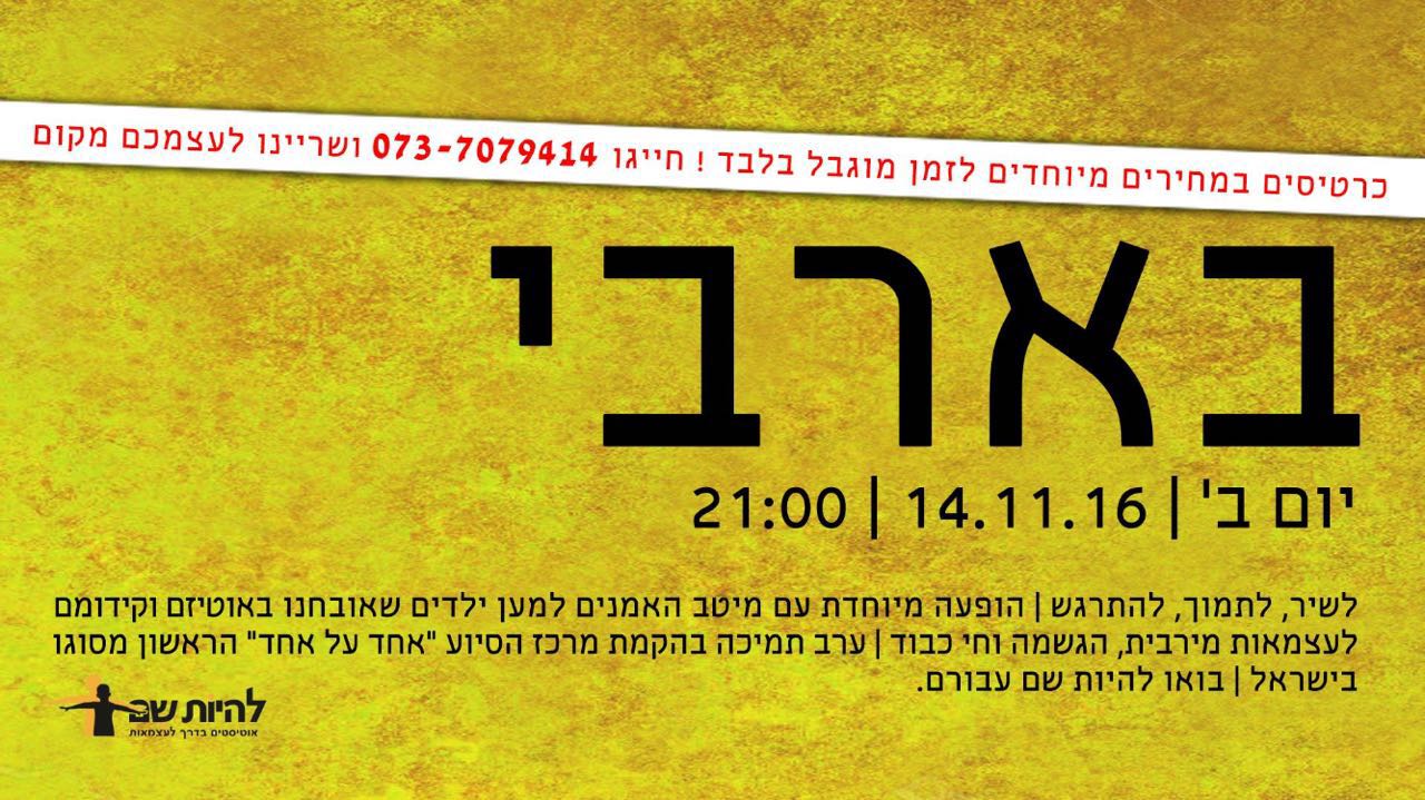 ב 14 בנובמבר, יום שני, במועדון הבראבי בתל אביב, יתקיים ערב התרמה למען עמותת "להיות שם" הפועלת לקידום טיפול פרטני בילדים אוטיסטים.