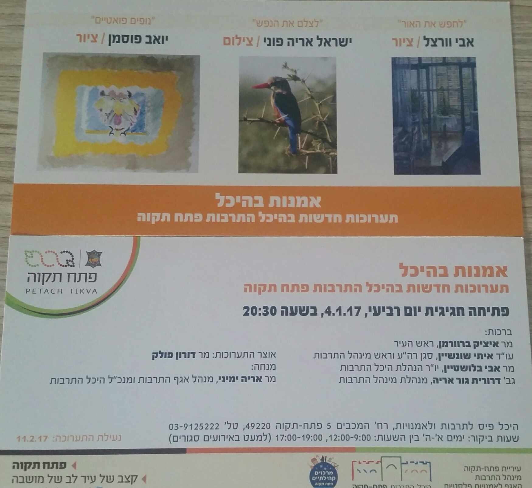 פתיחת התערוכה ב 4/1/17 בשעה 20:30 בהיכל התרבות פתח תקוה, רחוב המכבים 5.