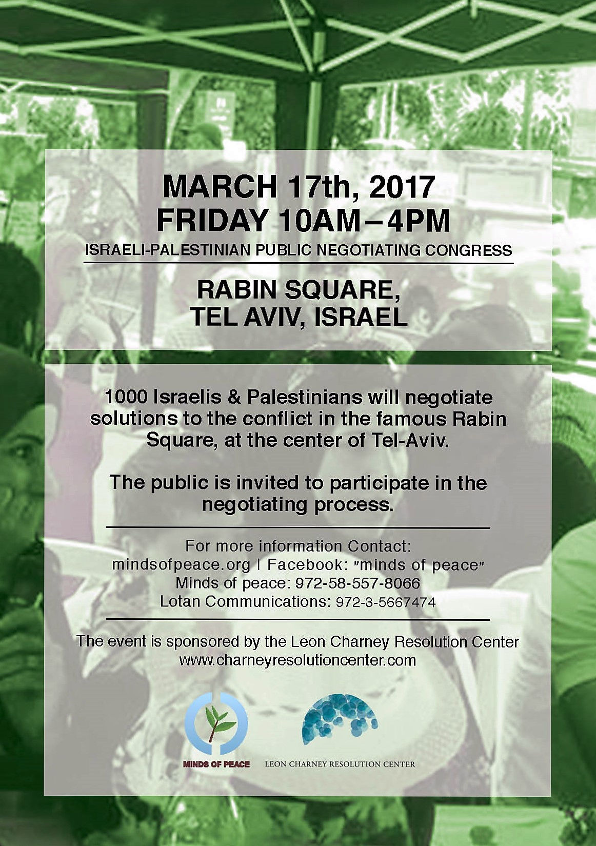 בתאריך 17/3/17 יגיעו לכיכר רבין משלחות של כ-1000 ישראלים ופלסטינים, במטרה לדון, לשוחח ולנהל מו"מ על פתרונות לסכסוך ועל אפשרויות ליצור מומנטום מהפכני לשינוי. הדיונים ייעשו בנוכחות קהל ובהשתתפותו.