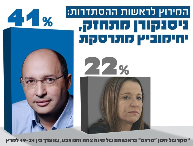 במחקר שנערך השבוע על ידי מכון "מדגם" בראשותם של מינה צמח ומנו גבע בו נשאלו חברי הסתדרות במי יתמכו לראשות ההסתדרות, עולה כי, מבין המצביעים, 41% מהמצביעים תומכים ביו"ר ההסתדרות הנוכחי אבי ניסנקורן, לעומת 22% בלבד שתומכים בשלי יחימוביץ'.