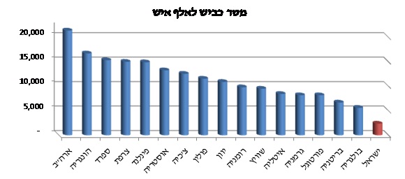 בישראל פחות מ-19 אלף ק"מ כבישים שהם 2,500 מ"ר כביש על כל 1,000 איש. את הטבלה העולמית מובילה ארה"ב עם למעלה מ-20 אלף מ"ר כביש על כל 1,000 איש ואחריה הונגריה, ספרד, צרפת ופינלנד.